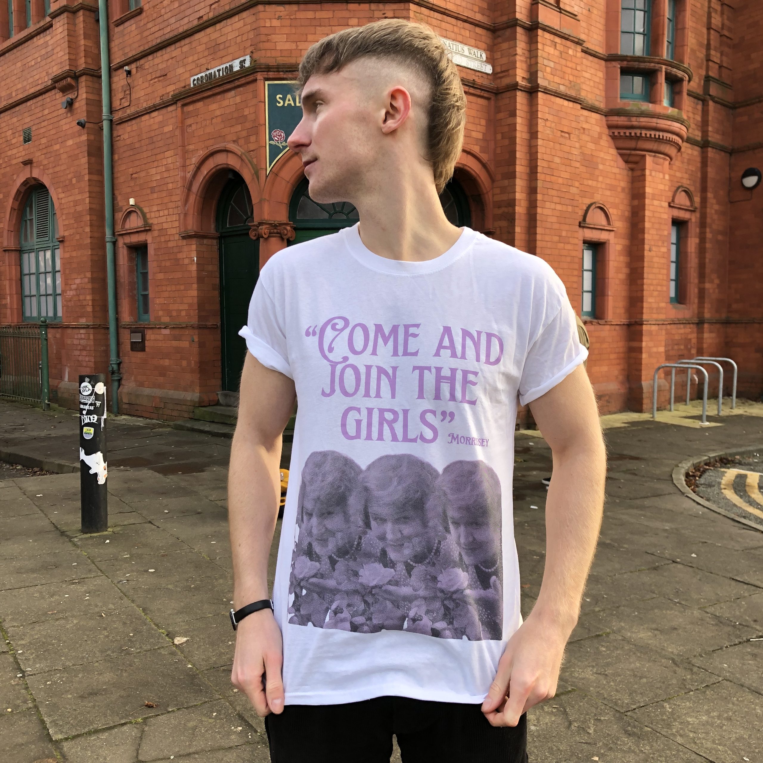 One fine day, an emotional whirl, you will be good to yourself and you’ll buy the Come And Join The Girls tee. Featuring the grandest of grand dames, Patricia Routledge, of Keeping Up Appearances fame, this white and purple design will ensure that you stand out at the next Morrissey gig. Now, come on, get your legs astride that bike and show the world what you’re made of. Designed by @all_you_need_is_moz on Instagram.